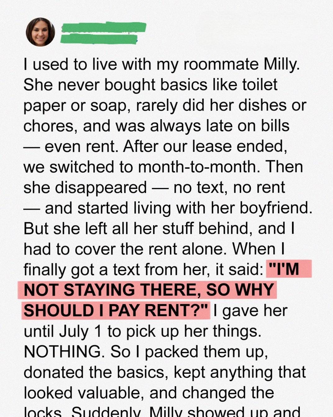 When I moved in, I thought having a roommate named Milly would make life easier. She was nice enough, but she never bought essentials, borrowed my things without asking, and was always late on rent. Month after month, she’d promise to pay me back “next week,” and it never happened.Then, one day, she just vanished —