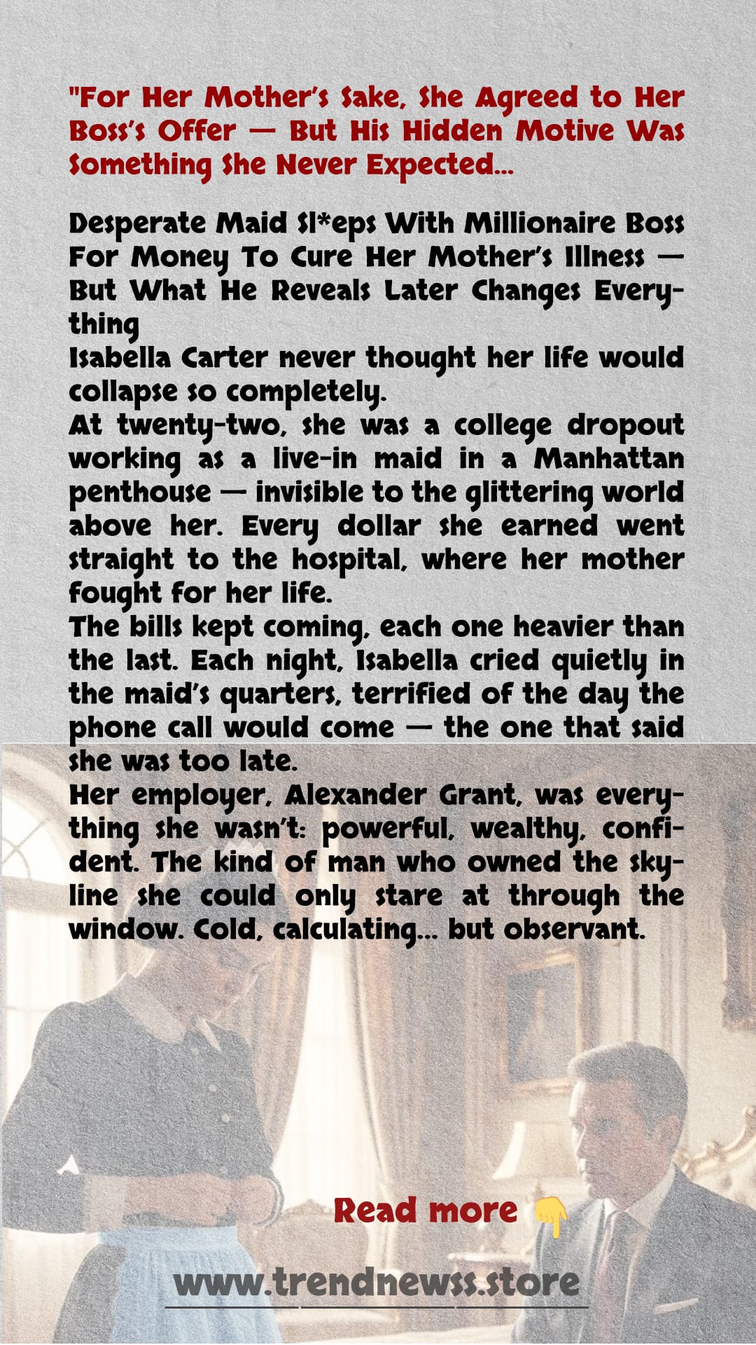 Later that night, with tears blurring her vision, Isabella walked into his bedroom. The encounter was cold, transactional, and it left her feeling hollow, like she had sold a piece of her soul. She cried silently as he drifted to sleep beside her, unaware of the storm breaking inside her chest.