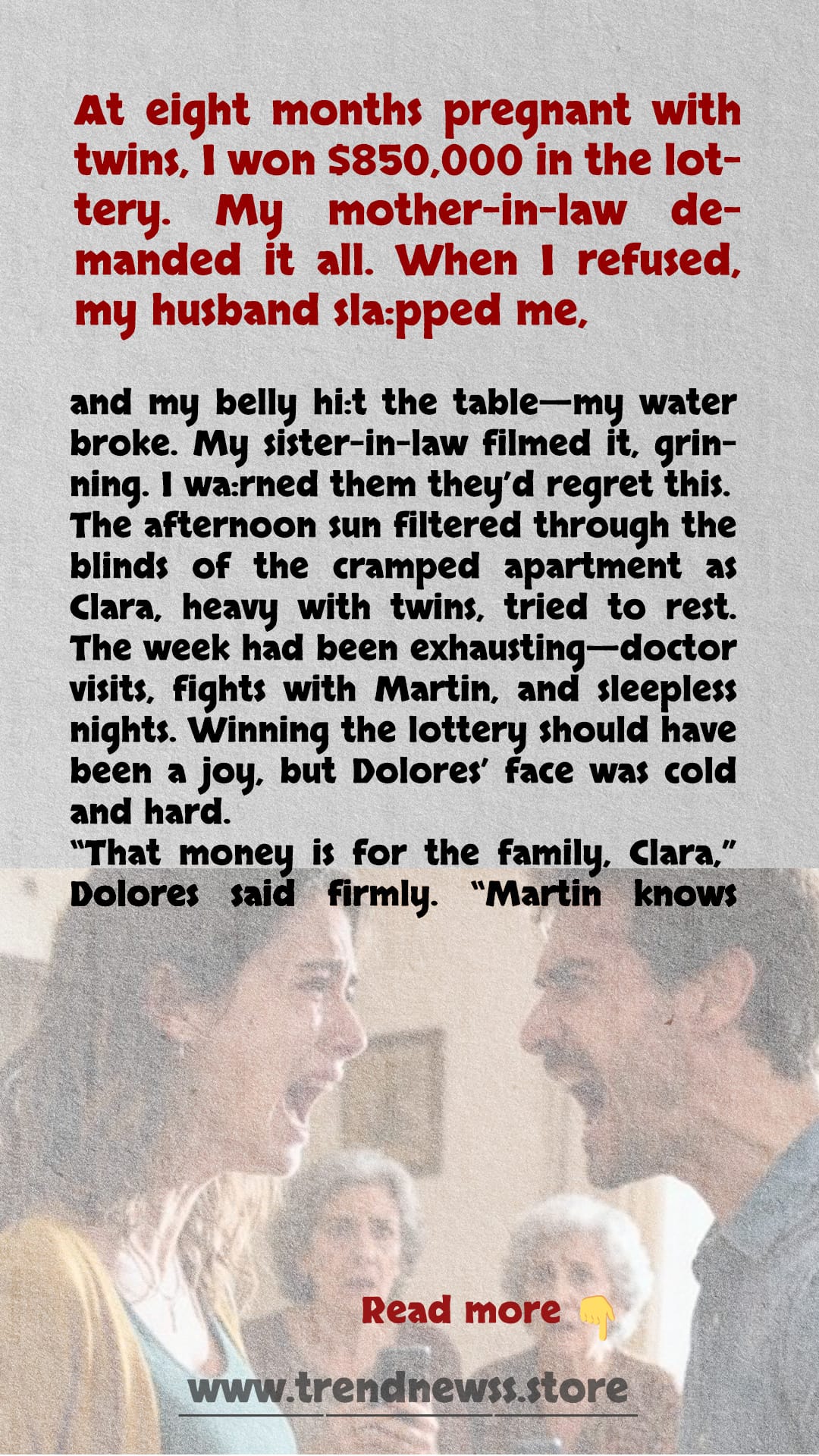 Suddenly, Martin slapped her. She stumbled, hitting her belly against the sharp edge of the table. Pain shot through her, and warm liquid ran down her legs and her water had broken.