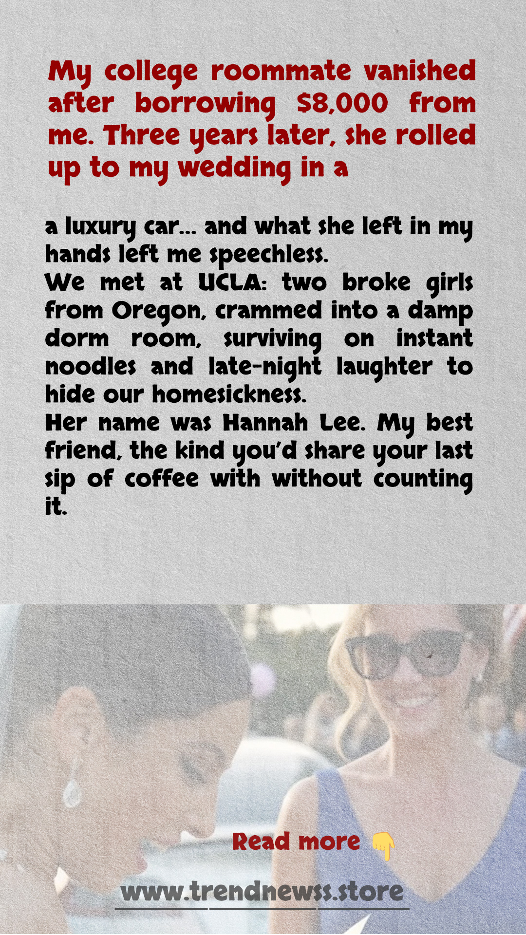 Emma and Sophie couldn’t have been more different. Emma was meticulous, practical, the kind of person who sorted receipts by color and memorized interest tables. Sophie was spontaneous, beautiful in a way that made strangers smile, with a laugh that could fill a room. They’d met during freshman orientation, two girls far from home sharing an umbrella that collapsed the first week of Santa Ana winds. By the end of that first month, they were inseparable.