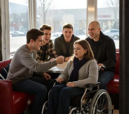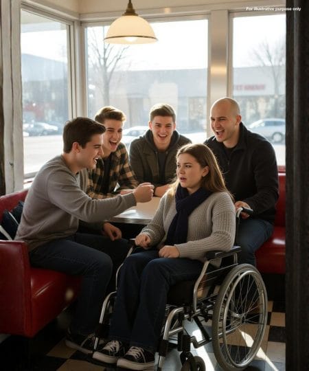 At a nearby booth, a group of teenage boys snickered cruelly. One “accidentally” knocked over his plate, sending pancakes splattering to the ground, syrup dripping like spilled guilt. Another pushed against her wheelchair, making it tremble.