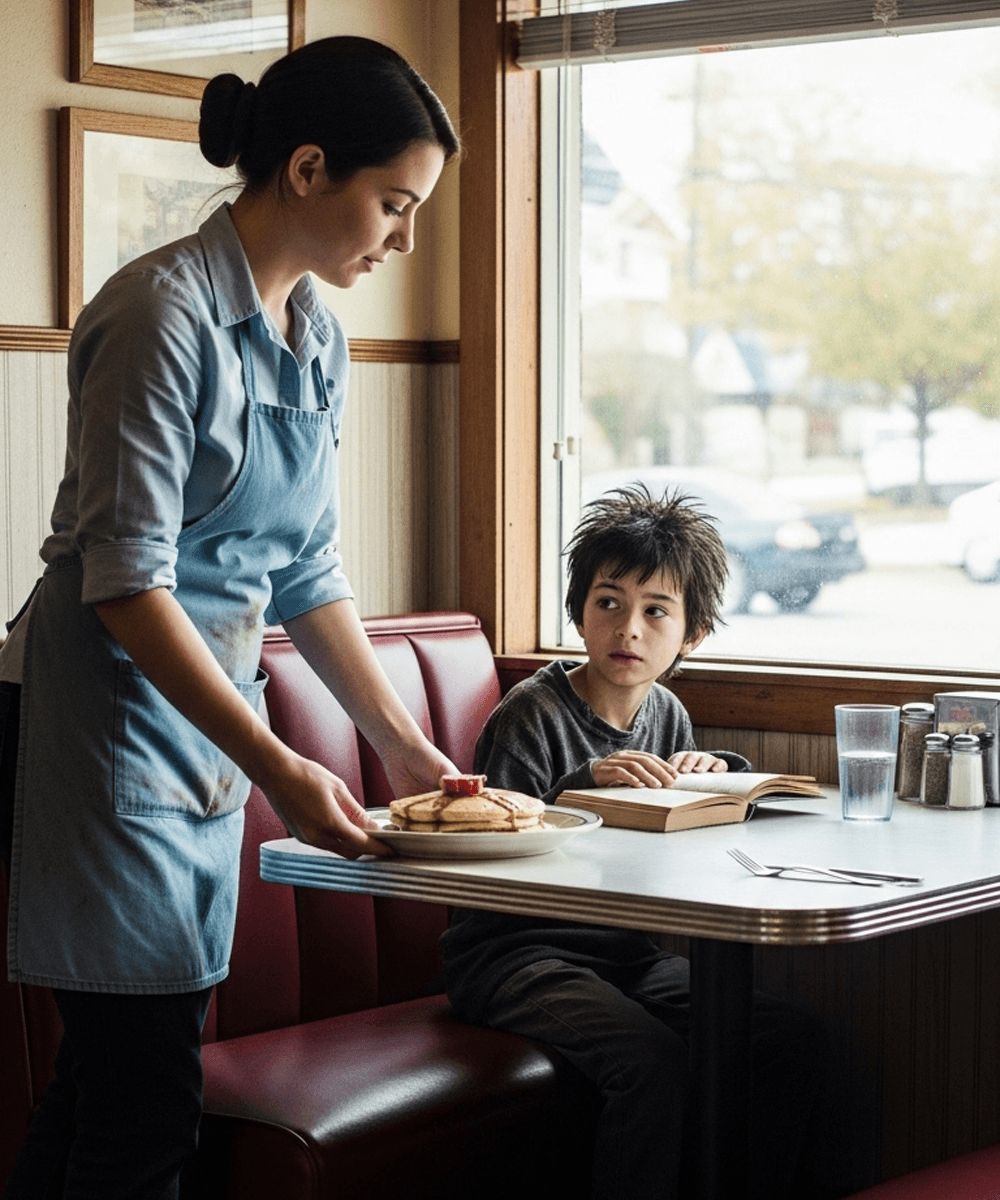 As she ate, David—now taller, more confident—entered the diner with his mother. He watched quietly, then whispered: