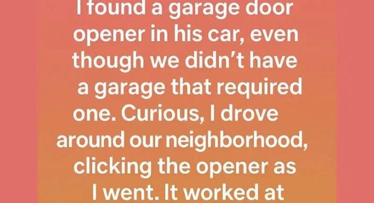 While sorting, I discovered a garage door opener in his car—even though we didn’t have a garage that required one. Intrigued, I drove around the neighborhood, pressing the opener as I went.