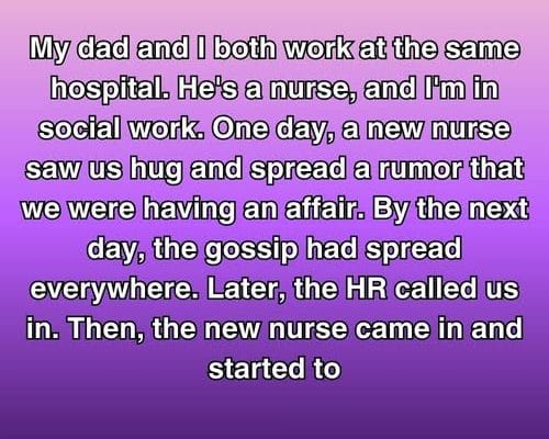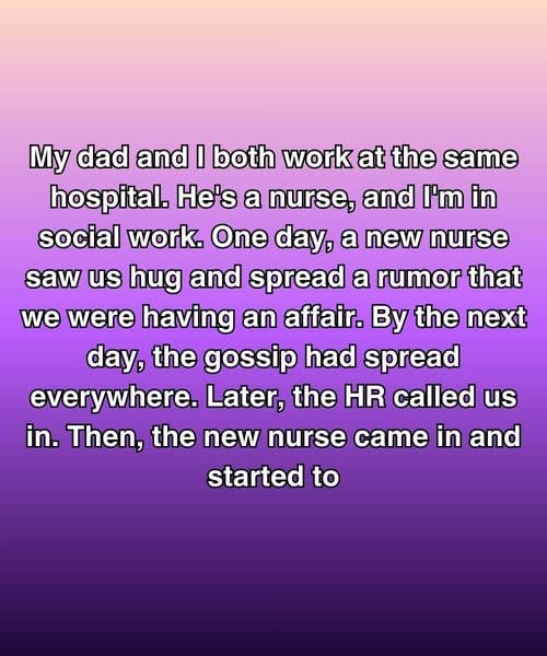 My dad and I both work at the same hospital. He’s a nurse, and I’m in social work. One day, a new nurse saw us hug and spread a rumor that we were having an affair.