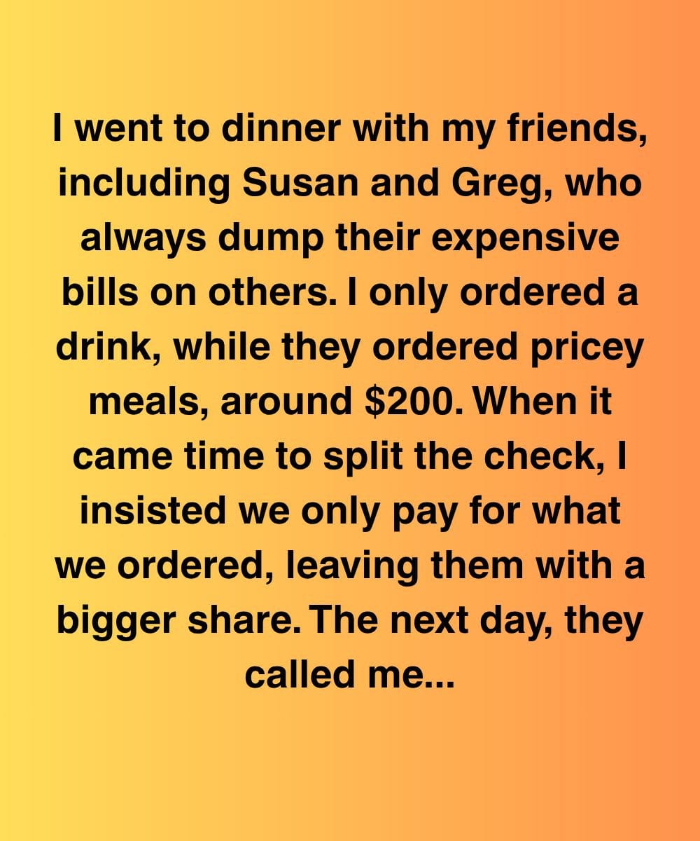 Dead silence. Then Greg said, “Well, maybe next time, you can just speak up earlier, before the check comes. It’s about the vibe, you know?”
